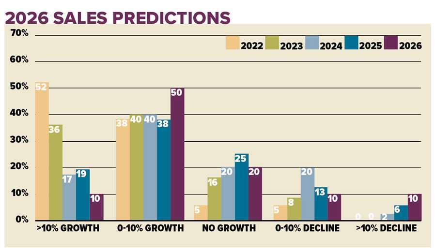 From the manufacturers’ perspective, 50% expect sales growth of 0–10% in 2026. Fewer respondents anticipate growth above 10%, while a larger share now expect sales declines compared to last year.