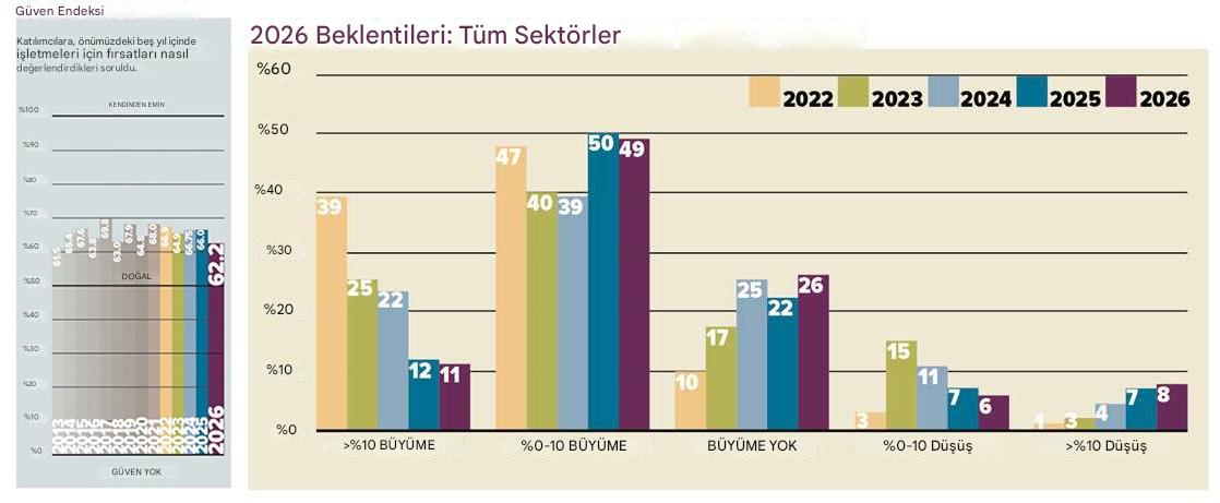 Anketin temel göstergelerinden biri olan Güven Endeksi, katılımcılardan önümüzdeki beş yıla ilişkin iş beklentilerini 100 üzerinden puanlamalarını istiyor. Bu yıl endeks 62,2 seviyesine gerileyerek 2018’den bu yana en düşük değerini aldı.