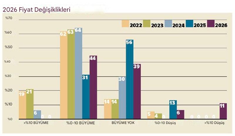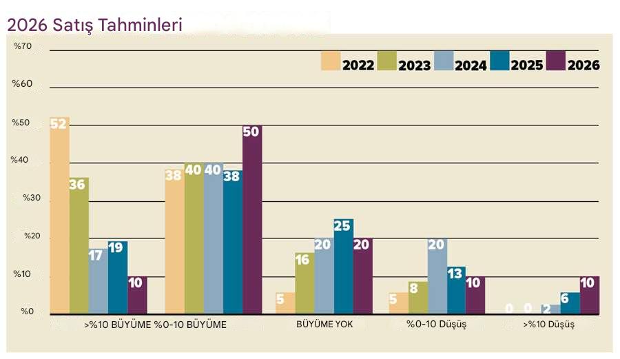 Üreticiler açısından bakıldığında, katılımcıların %50’si 2026’da satışların %0–10 aralığında artmasını bekliyor. %10’un üzerinde büyüme öngörenlerin sayısı azalırken, satışlarda düşüş bekleyenlerin oranı geçen yıla kıyasla artmış durumda.